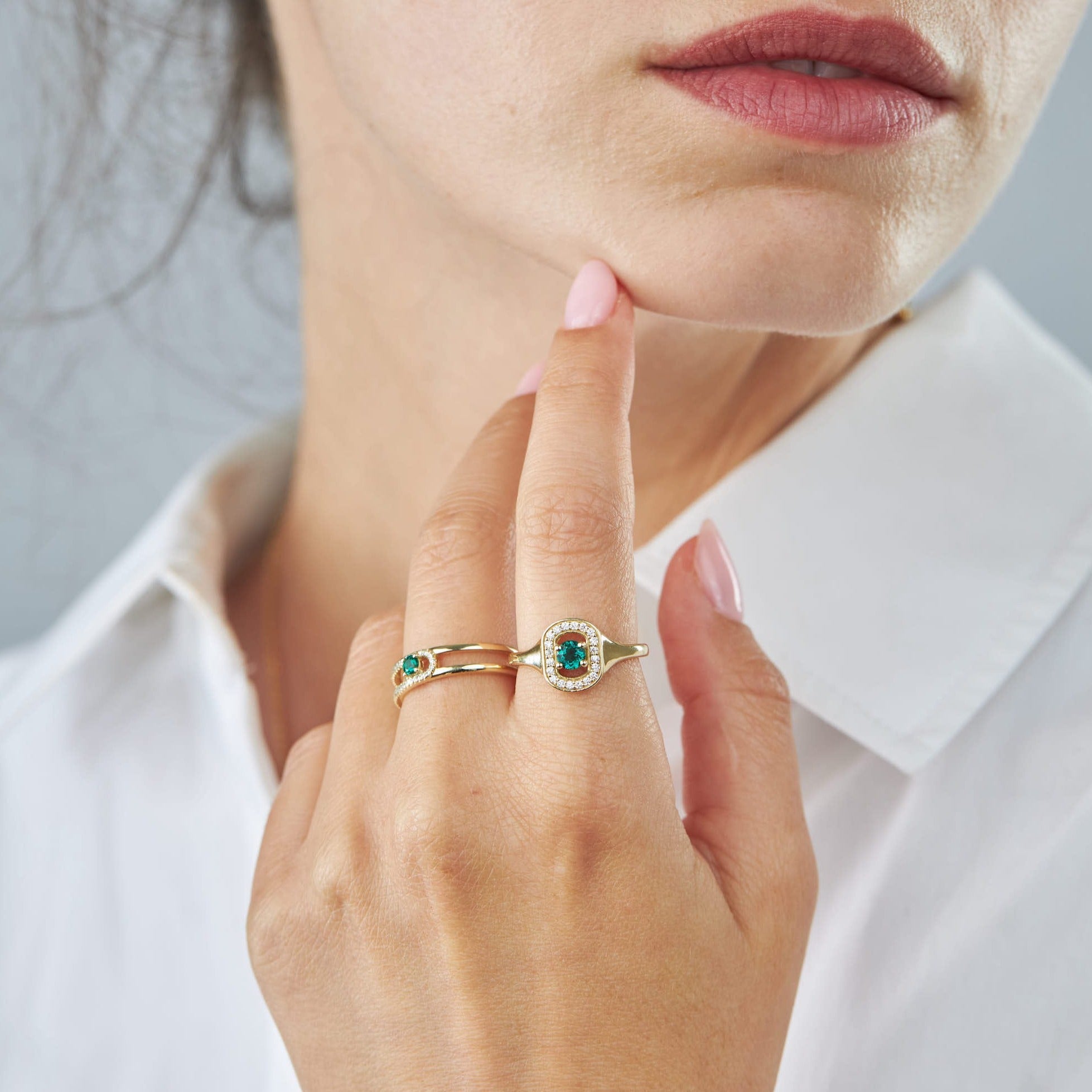• טבעת אמרלד ויהלומים לבנים – טבעת חישוקית מעוצבת ומרשימה ביופייה המשלב בתוכה אמרלד בגודל של 3 מ"מ ו-41 יהלומים משובצים, כאשר בגב הטבעת קיים אלמנט נסתר לעיניה של עונדת הטבעת בלבד.